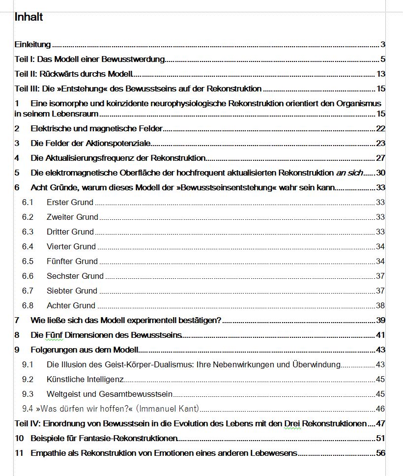 Die Argumentation kreist um den Begriff »Rekonstruktion«. Daher wird die neurophysiologische Rekonstruktion der Außenwelt, welche die »Grundlage« von Bewusstsein ist, in ▶ Teil IV in den großen Gesamtzusammenhang der »Evolution in Drei Rekonstruktionen« gestellt. – Dahingegen findet eine Einordnung in die Geistesgeschichte (philosophische Erkenntnistheorie) ebenso wenig statt wie eine Verankerung in der aktuellen, einschlägigen Literatur zum Thema »Bewusstsein« bzw. in die Neurowissenschaften. – Provokant formuliert: